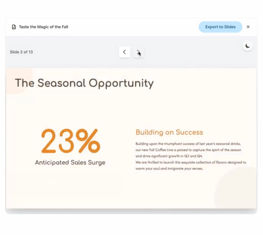 For example, you could type: "Create a presentation from this Q4 revenue projections doc." Or, you could be more specific: "Make a 10-slide presentation summarizing the key takeaways from this Q4 revenue report. Focus on sales growth and future outlook."