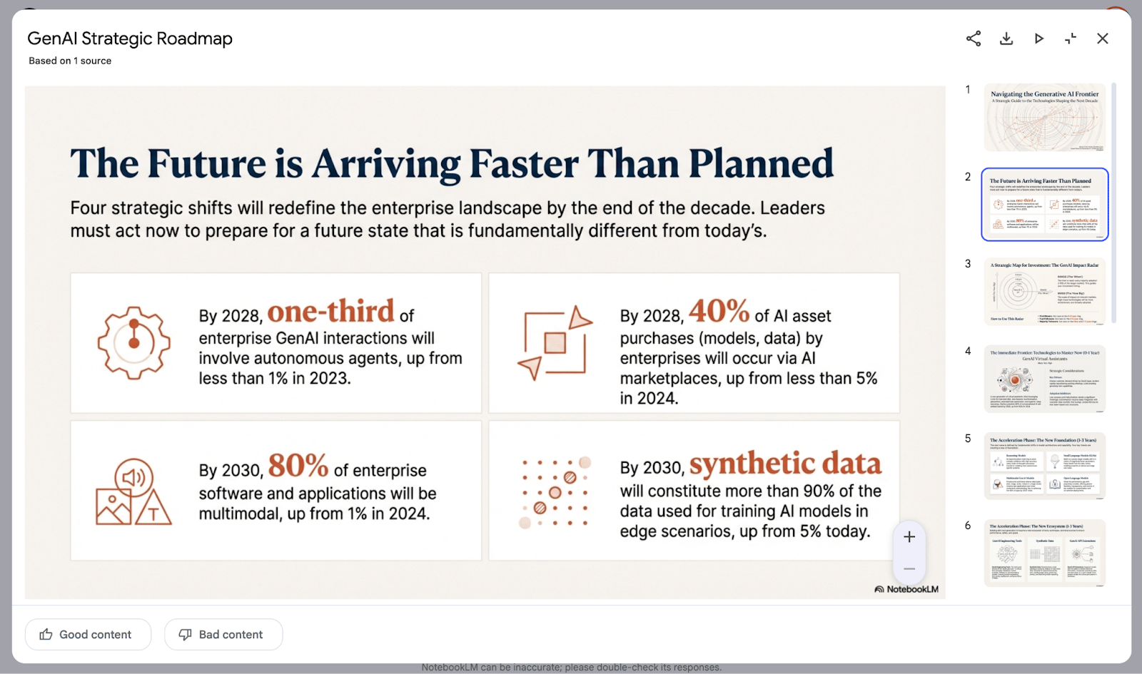 Review depth & accuracy: Browse slides to check detail, visuals, and synthesis across sources. This is where NotebookLM shines vs single‑doc tools.